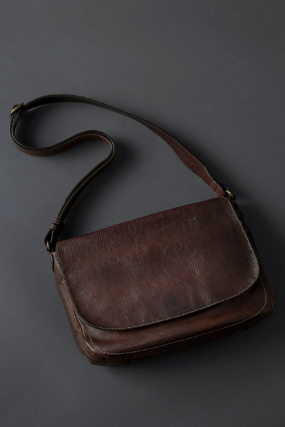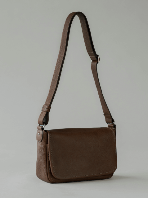 手荷物がコンパクトに収まり、外出が軽快に楽しめるミディアムサイズのショルダー。ボディとフラップで「オイルヌメ革」をたっぷり味わえます。