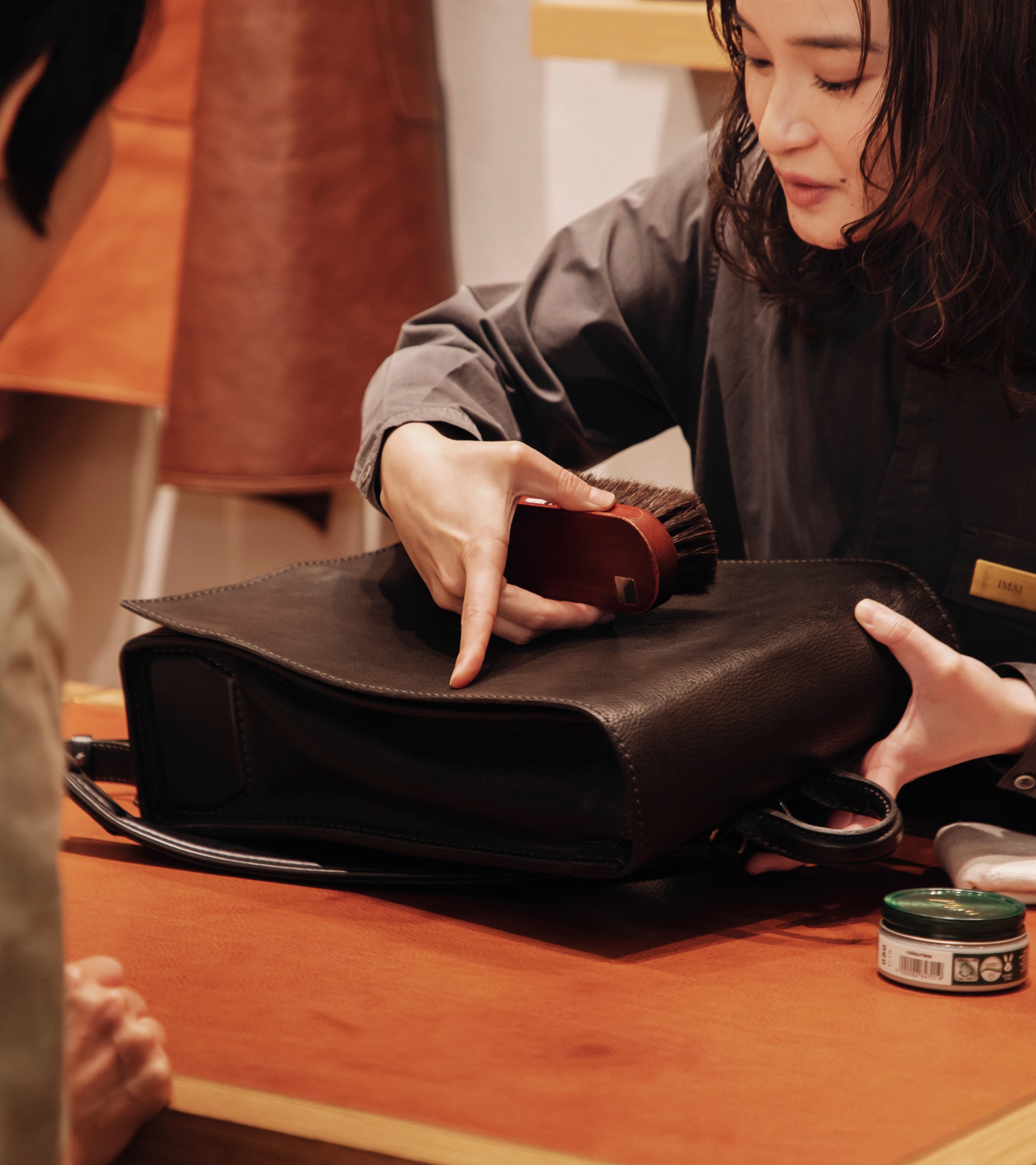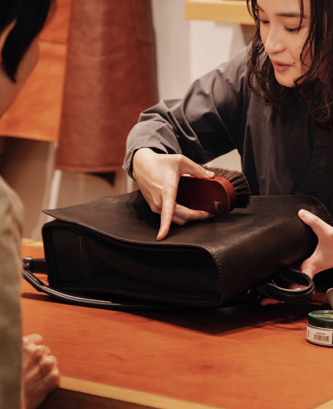 アフターサポート時が経っても使い手に寄り添うデザインと、永く愛用できる丈夫さ。そんなふうに製品そのものが「Timeless」であるだけでなく、永く愛用したいという使い手の思いを叶えることも、土屋鞄が考える「Timeless」の要素です。製品の寿命を延ばすケアサービスや、何年前の購入品であっても、製品が役目を終える日まで修理を受け続ける永久サポートなど、アフターサポートに力を注いでいます。