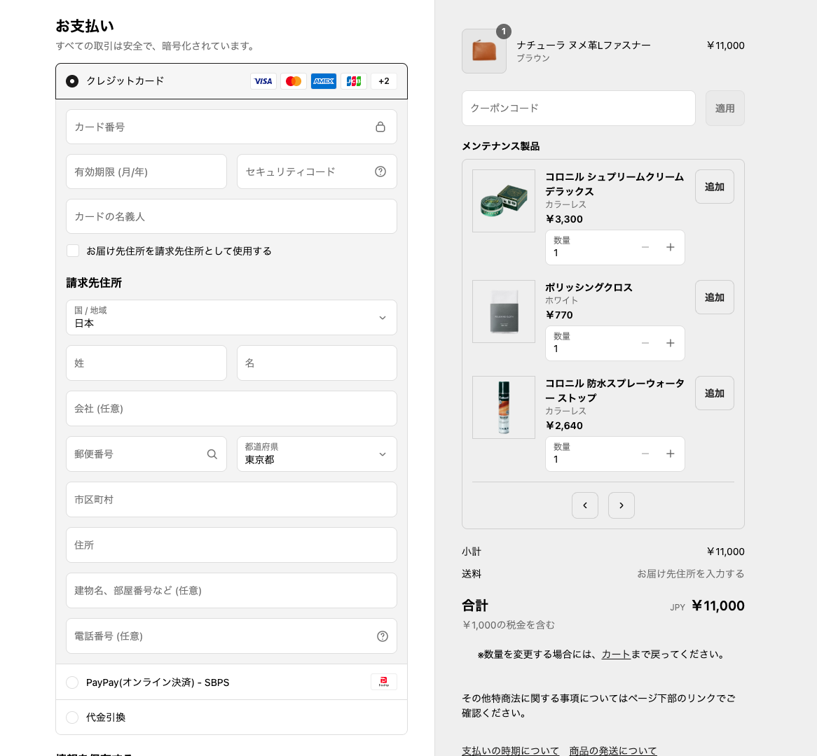 お支払い方法は、クレジットカード・代金引換・当社指定の外部決済からお選びいただけます。請求先住所を別に指定したい場合は、「請求先住所」欄の記入をお願いいたします。