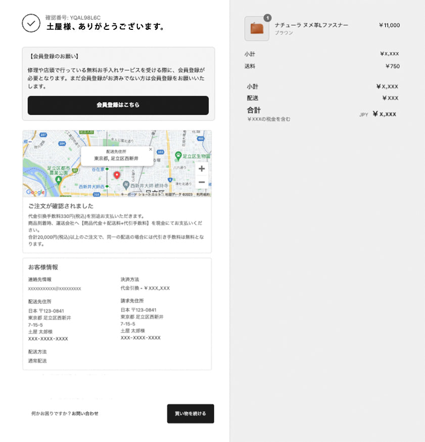 当社担当者が受付を確認後に送信する、件名<【土屋鞄製造所】ご注文を承りました>のメールをもってご注文の確定となります。