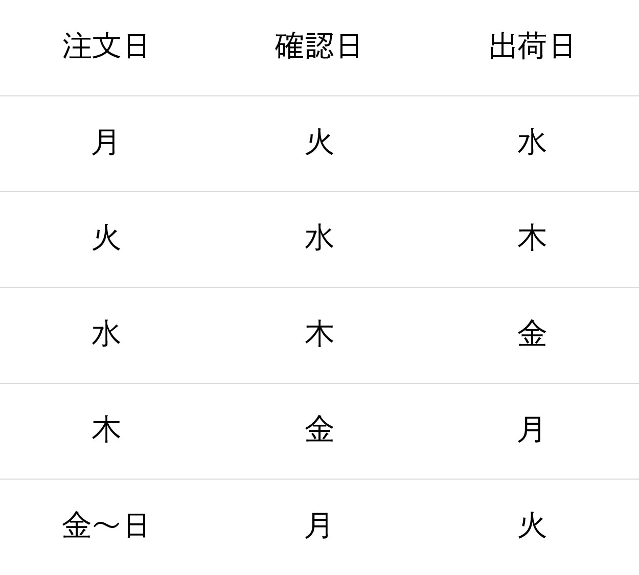 当社でご注文を確認した日の「翌営業日」に出荷いたします。ご注文いただいた曜日・時間によって出荷日が異なりますので、表をご参考ください。ご注文はそれぞれ朝8:00に締め切り、当日中に確認作業をいたします。
