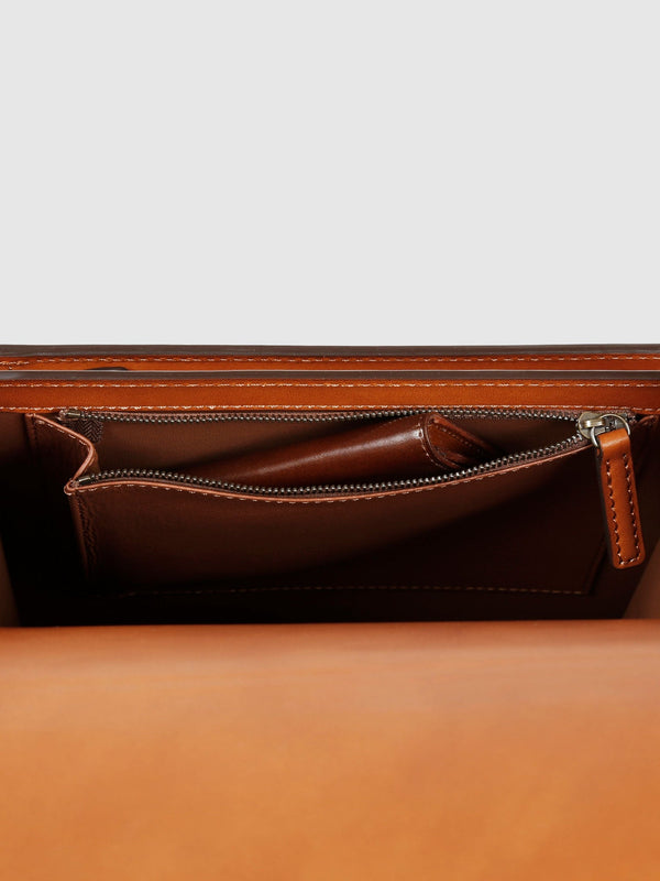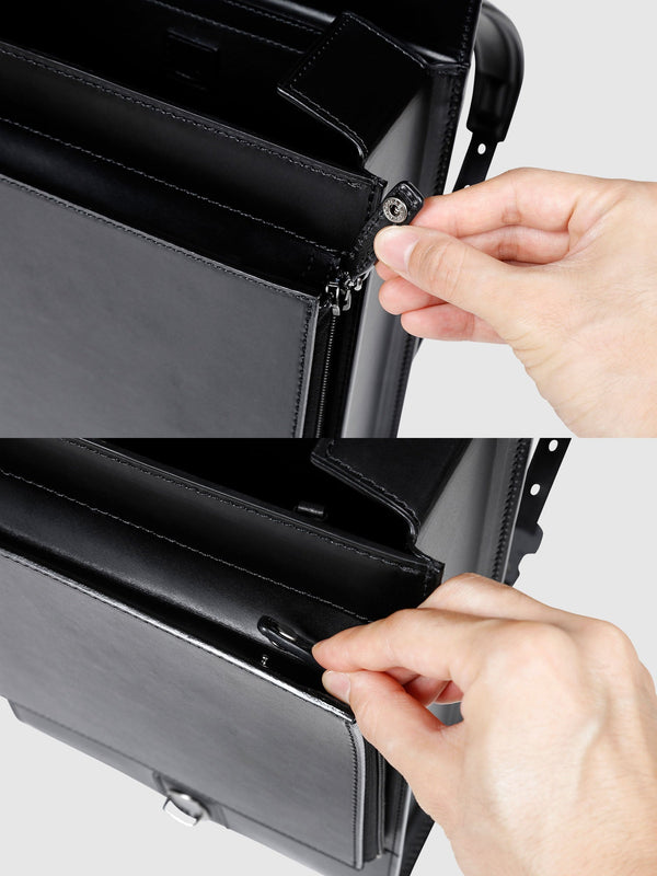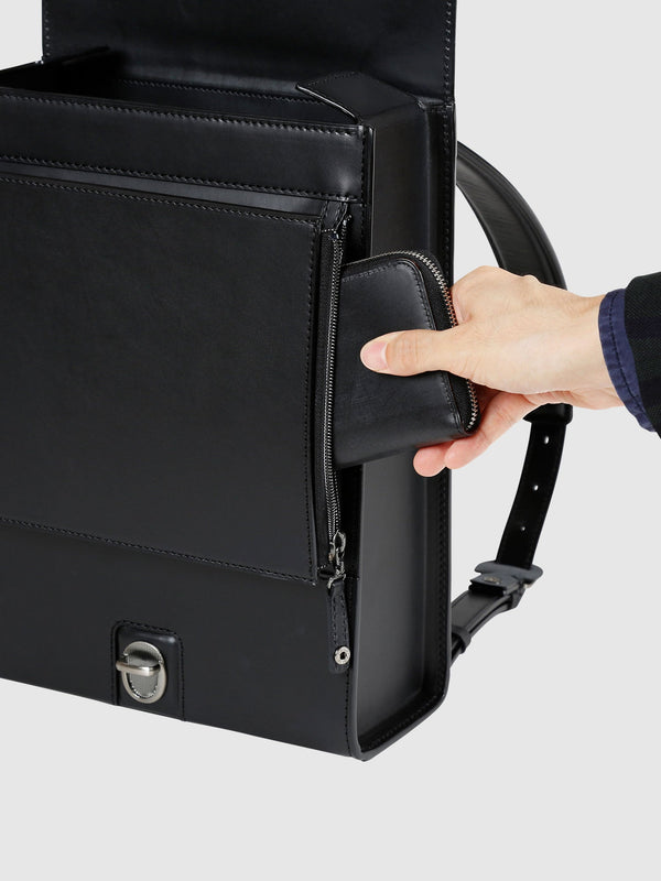 フラップの下には、見た目以上の収納力を発揮する折り畳みマチ付きのファスナーポケットを設置。