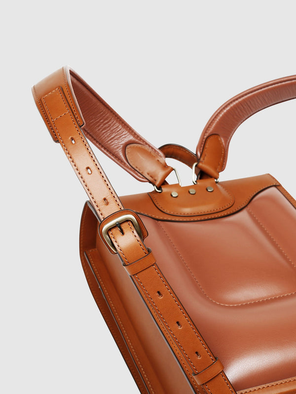ショルダーベルトは8段階で長さ調整が可能。背中は通気性に優れる「ソフト牛革」で仕立てました。また、中にクッション材を内蔵しているため、肩に食い込みにくくなっています。