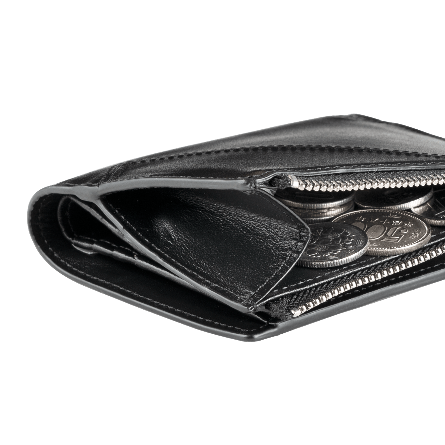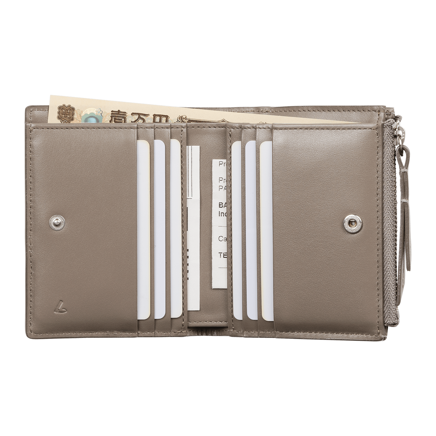 財布を開くと「TSUCHIYA KABAN」の"T"が浮かぶ、革の切り替えが印象的なデザインの「Tレティ」。きめ細やかでしなやかな表情の牛革が、手元を上品に。小さめの鞄に収まるよう、収納容量を保ちつつ、コンパクトに仕上げました。